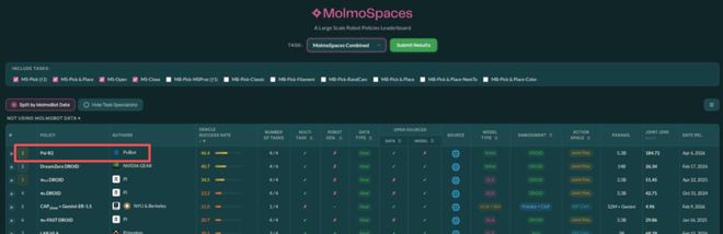 MolmoSpaces 是当前具身智能领域少数与真实世界评测具有较强相关性的公开基准之一。NVIDIA、PI 等全球顶尖团队均参与本次评测。而 Psi-R2 位列其上。