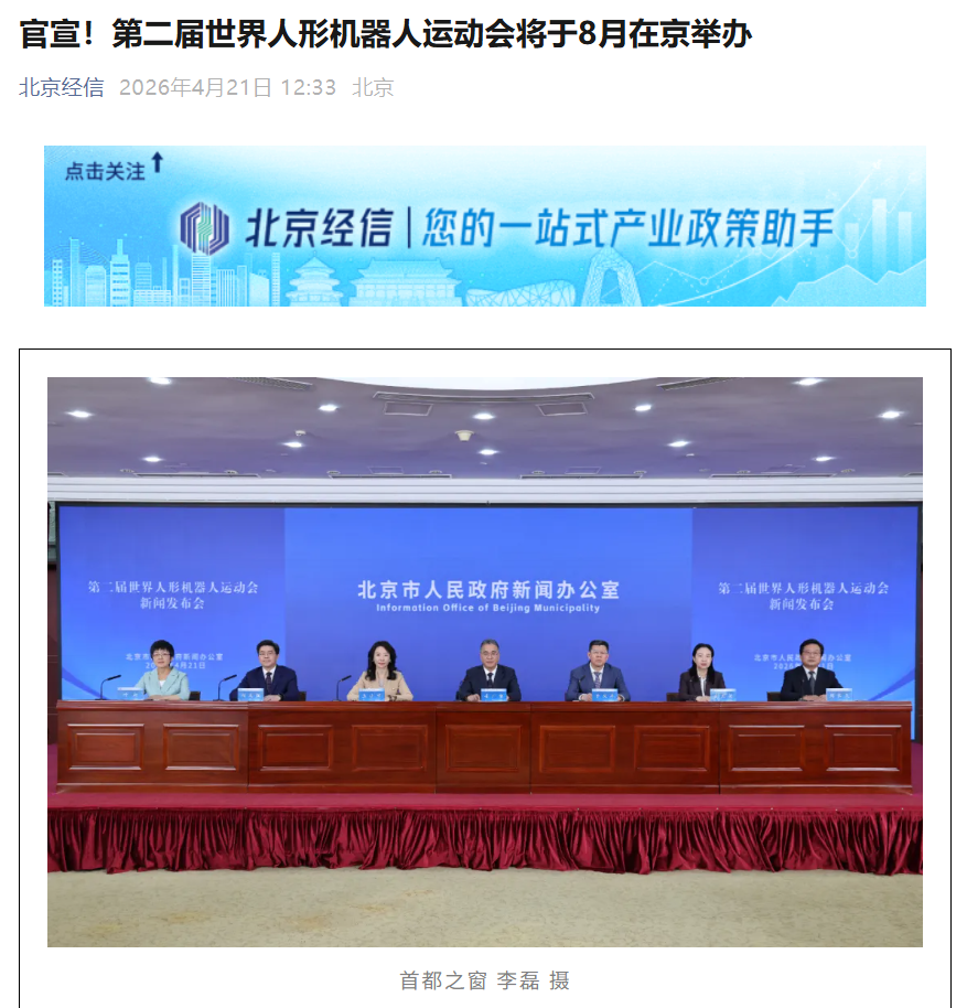 4月21日,北京市政府新闻办公室召开会议,宣布了有关第二届世界人形机器人运动会的最新消息。