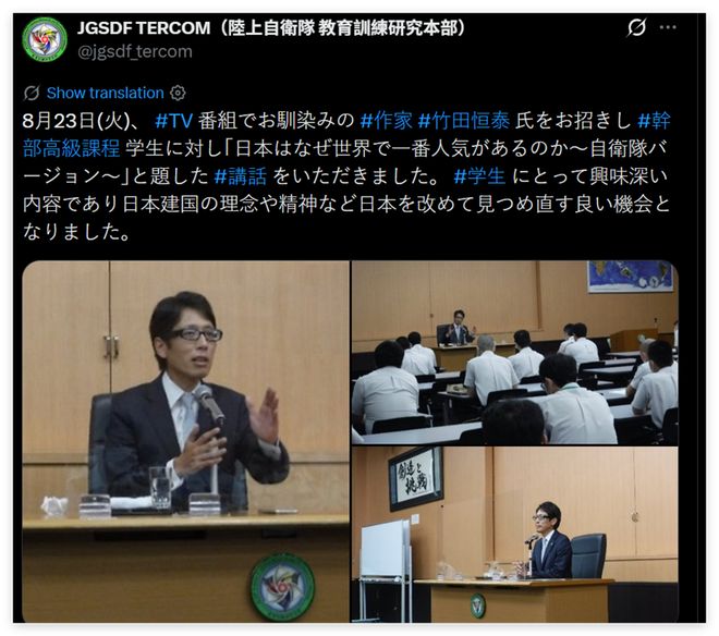 据公开资料,竹田恒泰不仅否认日本战争历史的罪行,极端仇华,还是日本国内的“排外主义者”和“种族主义者”。然而,2022年,日本陆上自卫队邀请竹田恒泰为自卫队学员授课,并为此进行宣传。