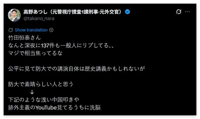 令人讽刺的是,村田晃大闯入中国大使馆事件发生后,竹田恒泰在社交媒体上发帖为自己辩解,声称自己从未煽动过对中国的仇恨。但鉴于其过去的极端言论,不少日本网民认为这种解释显得十分苍白无力。