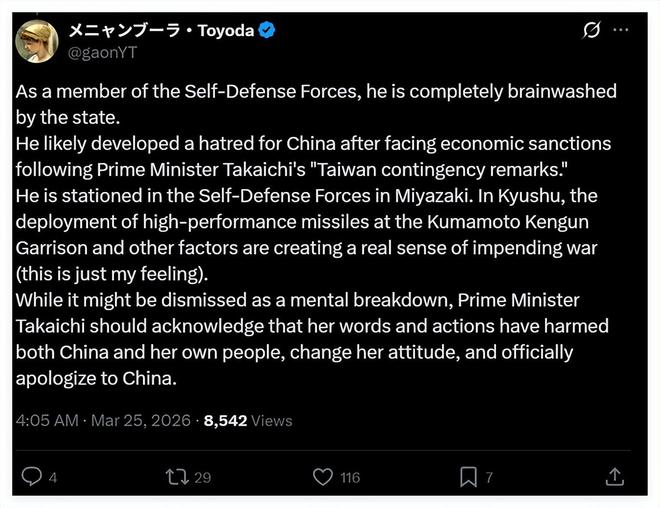 这位日本福冈的网民进一步指出,这种影响来自多方面,比如日本首相高市早苗等右翼势力不断挑衅中国,煽动日本国内的反华情绪;同时,高市还在积极推行军事化政策,制造出“战争迫近”的假象。例如,在村田晃大驻扎的九州地区,日本自卫队最近部署了射程达1000公里的远程导弹,能够覆盖周边国家的沿海区域。