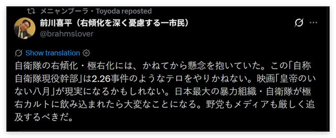 一些日本网民警告说,如果日本自卫队继续向右翼甚至极右翼思想倾斜,对日本来说将是巨大的灾难。