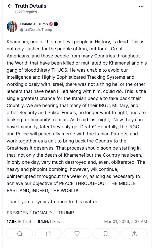特朗普在其社交媒体平台“真实社交”上发文称,在美以联合袭击行动中,哈梅内伊已经丧生。