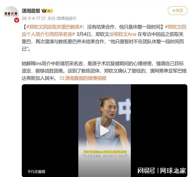 同时,关于郑钦文解除与功勋教练佩雷里巴合作关系的消息也引起了广泛关注。在印第安维尔斯举行的媒体日上,中国一姐对此进行了正面回应。