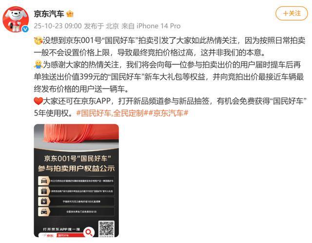 京东方面表示,最终的拍卖价格远超预期,并非有意为之,同时承诺向每一位竞标者提供价值399元的新车大礼包及其他权益。此外,对出价最接近实际成交价的用户赠送一辆汽车。