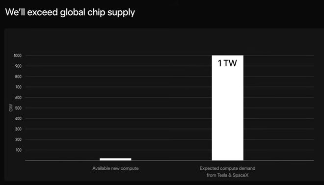据马斯克透露,TERAFAB项目的目标是每年生产出一太瓦的计算能力,这将远远超出目前地球上所有芯片工厂的总和,后者仅能满足TERAFAB项目需求的大约2%。