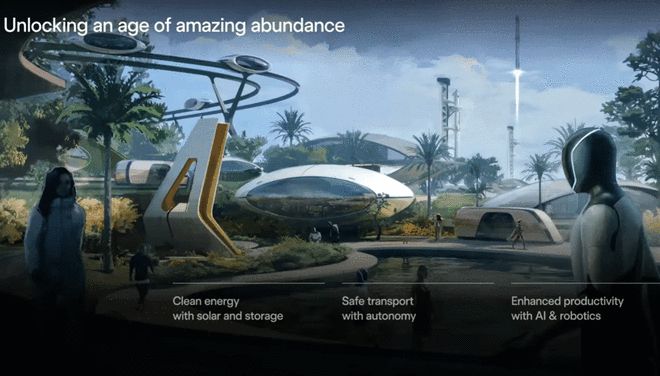 这看起来有点像电影《蠢蛋进化论》(Idiocracy)的开场,伴随着惊人的富足时代的开启。显然,其中的元素是可持续能源、太空旅行,以及为每个人带来惊人富足的AI和机器人。这也是通往惊人富足的唯一途径,也就是AI和机器人。这并不是说它不会出问题。但愿不会,我认为它可能会走向好的方向,那将是一个你喜欢的未来。至少这是我能想到的最好的未来。