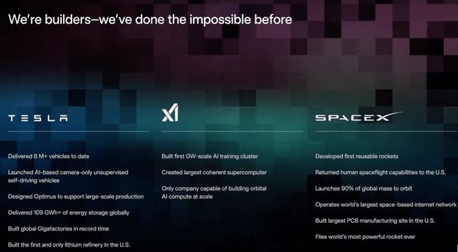 不过,对人类来说,这个目标本身就已经极其艰巨。要实现它,真正需要的是SpaceX、xAI和特斯拉结合各自的努力,共同打造这个史诗级的Terafab项目。你们都知道,特斯拉、xAI和SpaceX都做过很多人们曾经认为不可能的事。比如得克萨斯的超级工厂,正在造的擎天柱机器人,全球的超级充电网络,真的非常多。