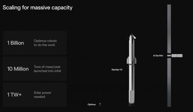 我们管它叫迷你卫星,因为它只有100千瓦。我们预计未来的卫星可能会达到兆瓦(megawatt)级别。要达到每年一太瓦的算力,你需要每年向轨道运送约1000万吨的载荷(按每吨100千瓦算)。我们确信这是可行的。到达那里不需要任何新的物理学或不可能的事物。所以我其实有信心,SpaceX能达到每年1000万吨的轨道运载能力。