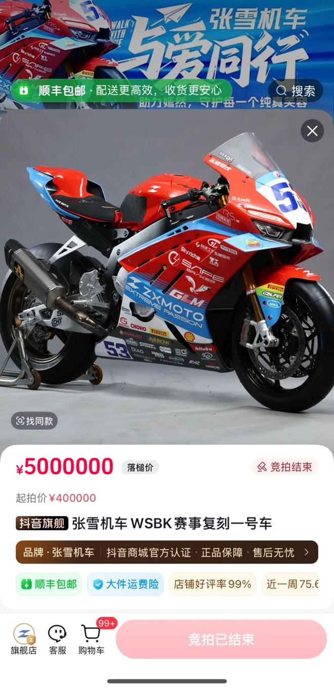 4月10日晚7点48分,张雪机车在其官方直播间举办了WSBK夺冠车型的复刻版线上竞拍活动,吸引了众多网友的关注和参与。