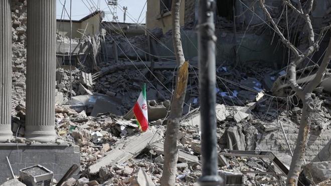 废墟上插着伊朗国旗
