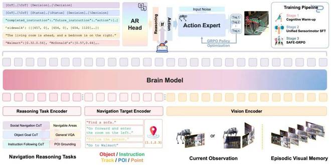 第一层是统一多模态编码器,它负责将图像、历史观测、文本指令、空间坐标全部映射到同一个语义空间。不同任务在进入模型之前就已经「说同一种语言」,后面的决策可以在同一个上下文里展开。