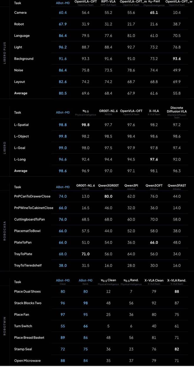 从结果来看,ABot-N0 这套方法在工程上完全跑得通,在一系列高难度基准上与现有方法拉开了明显差距。并且这种领先不是集中在单一指标,横跨了多个任务和场景。