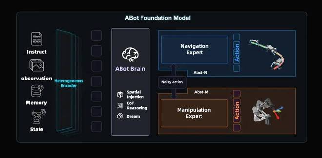 ABot的核心是两大基座模型:导航侧的ABot-N0和操作侧的ABot-M0。前者处理机器人的路径规划问题,而后者负责具体任务的操作细节。
