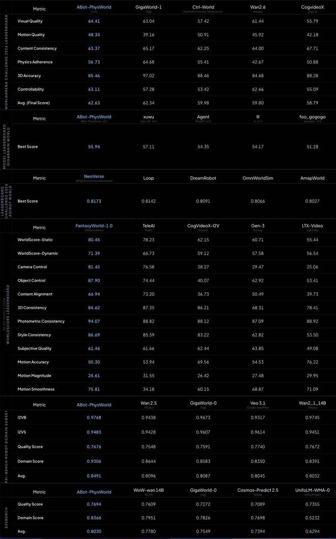在 WorldScore、WorldArena、AGIbot、PBench、EZSBench 等权威评测榜单上,ABot-World 都拿过 SOTA,甚至在一些指标上力压了英伟达 Cosmos、谷歌 Veo 和 OpenAI Sora 2 等多个开闭源方案。