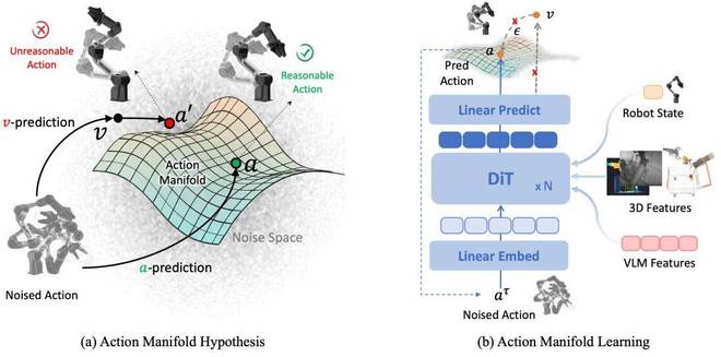 接下来,ABot-M0 在表示和训练方式上做了关键调整:不让模型先学去噪再慢慢还原动作,直接去学「什么样的动作本身就可行」。原因也不复杂,真实世界可行的动作不是到处都有,它们往往集中在一小块受物理规律和任务约束限制的有效区域里。与其在整个空间里找答案,不如一开始就把学习范围限定在这块有效区域内。