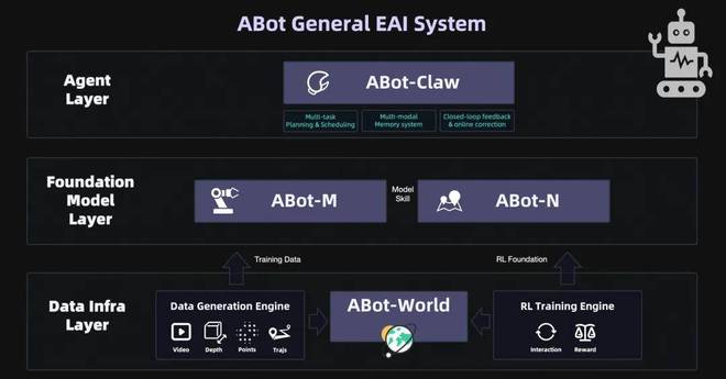 这是一个贯通数据、模型与 Agent 的三层架构,数据层依托 ABot-World 世界模型,模型层依托 ABot-N0 导航决策与 ABot-M0 精细操作,Agent 层依托 ABot-Claw 任务调度与闭环纠错。