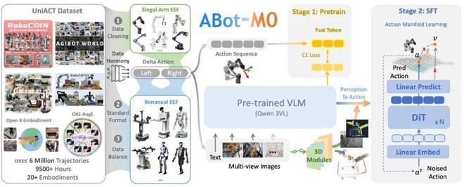 ABot-M0 走的是另一条路:没有围绕某一类机器人或某一类任务单独建模,从一开始就用一套统一的动作表示,把来自不同来源、不同形态的数据放到同一个体系里