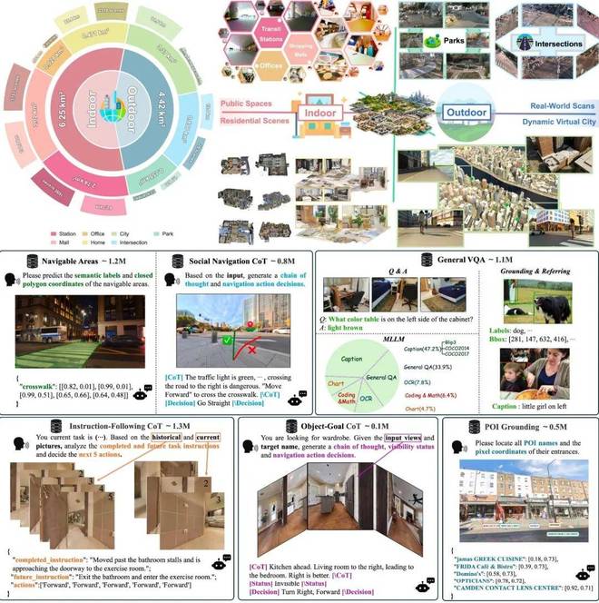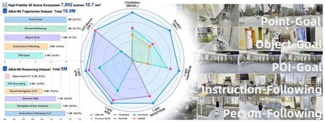 ABot-N0 之所以能把导航能力做统一、做泛化,很大程度上依赖其构建的具身智能领域目前最大的数据引擎:包括 7802 个高保真 3D 场景、覆盖五大导航任务的 1690 万条专家轨迹以及覆盖空间关系、社会规则和长程规划的 500 万条推理样本。
