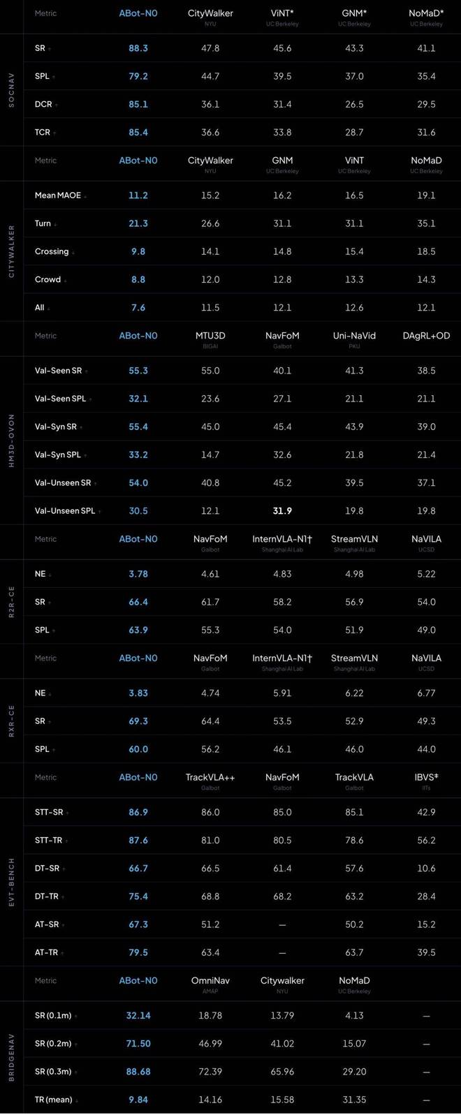 在 7 项国际权威具身导航基准(CityWalker、SocNav、R2R-CE、RxR-CE、HM3D-OVON、BridgeNav、EVT-Bench)上,ABot-N0 全部达到 SOTA,覆盖从室内到室外、从静态环境到人机混行的多任务范围。