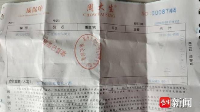 近日,江苏的吴女士(化名)在黑猫投诉平台投诉称,2026年2月21日,她和闺蜜一起去江苏泰州高港时代广场周大生门店购买了一款金戒指,花了7300元,“买回家后感觉圈口有些大了,于是第二天22日我和闺蜜一起去门店更换。当天闺蜜也决定要买这款戒指,门店店员表示店里没有合适圈口的,但可以去总部调货。”吴女士下单后,门店于2月27日到货,“我让老公去店里拿货,拿回家后,发现戒指的质保单上没有克数,金额也不对,戒指也没有吊牌。当时我对这些问题也提出了疑问,对于没有吊牌店员给予的解释是要得太急,老板娘直接把货给拿回来了,吊牌起码还要等一个礼拜。因为要到公司去录系统比较繁琐。后来门店在3月1日给我们重新开了质保单,基于对周大生品牌的信任,就复称了克重,没有纠结吊牌问题。”