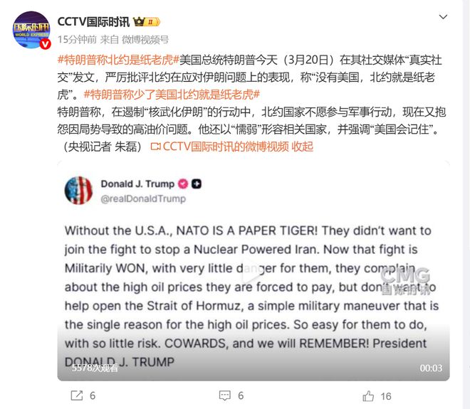当地时间20日,美国总统特朗普在其社交媒体“真实社交”上发文,批评北约在处理伊朗问题上的表现,称“没有美国,北约只是纸老虎”。