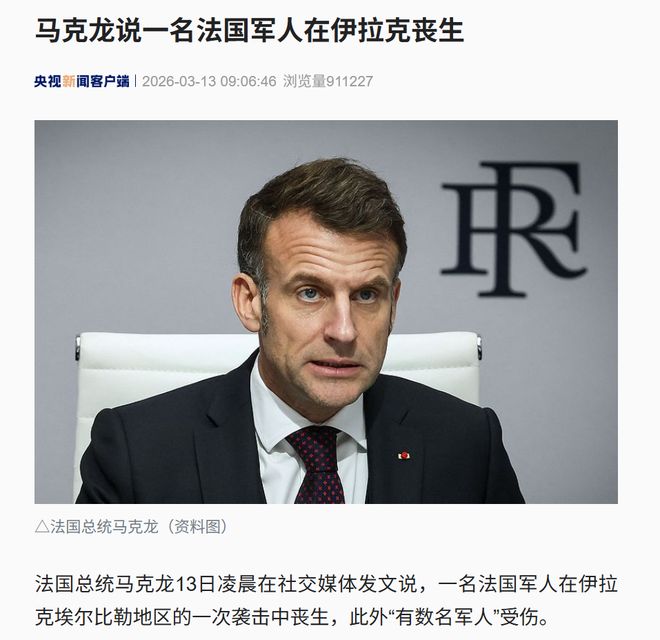 此外,北约其他国家驻伊拉克基地也遭到袭击。法国总统马克龙13日凌晨在社交媒体上发文说,一名法国军人在伊拉克埃尔比勒地区的一次袭击中丧生,还有“数名军人”受伤。马克龙称,袭击目标是法国自2015年来参与打击极端组织“伊斯兰国”的部队,这“不可接受”。法军驻扎伊拉克是为了打击恐怖主义,与伊朗相关的战事不能成为发动袭击的理由。