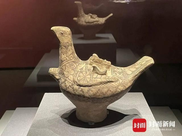 除了珍贵的黄金制品和动物形象艺术品外,展览还呈现了几件来自伊朗高原早期文明时期的陶器。其中一件鸟形来通杯尤为突出,其独特的造型与中国文化中的鸟类形象有异曲同工之妙。