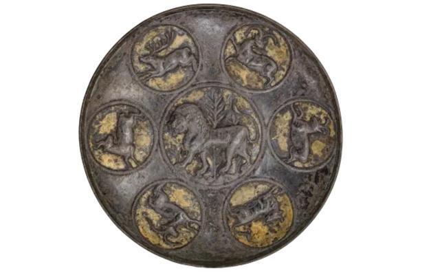 其中一件展品是采用“火法镀金”工艺制作的萨珊标志性的嵌金狮纹银盘,中心部分是一只雄壮的狮子,周围则是六种不同类型的动物形象。另一件引人注目的青金石饰黄金项圈则是在三颗大青金石上分别刻画了狮子头和人物像。