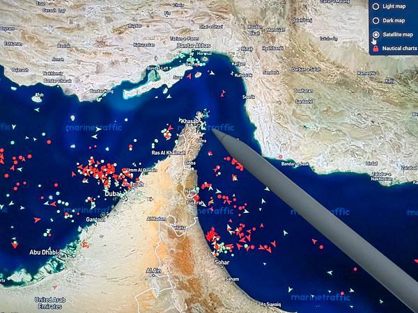 3月17日,MarineTraffic船舶追踪平台显示霍尔木兹海峡的船舶交通情况。图片