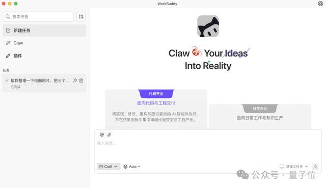 WorkBuddy的界面简洁明了,主要分为代码开发和日常工作两大区域,左侧设有新建任务、Claw及插件三个入口。