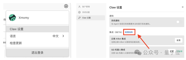 用户需要在右上角的头像菜单中找到「Claw设置」选项,并在那里查看「配置指南」。