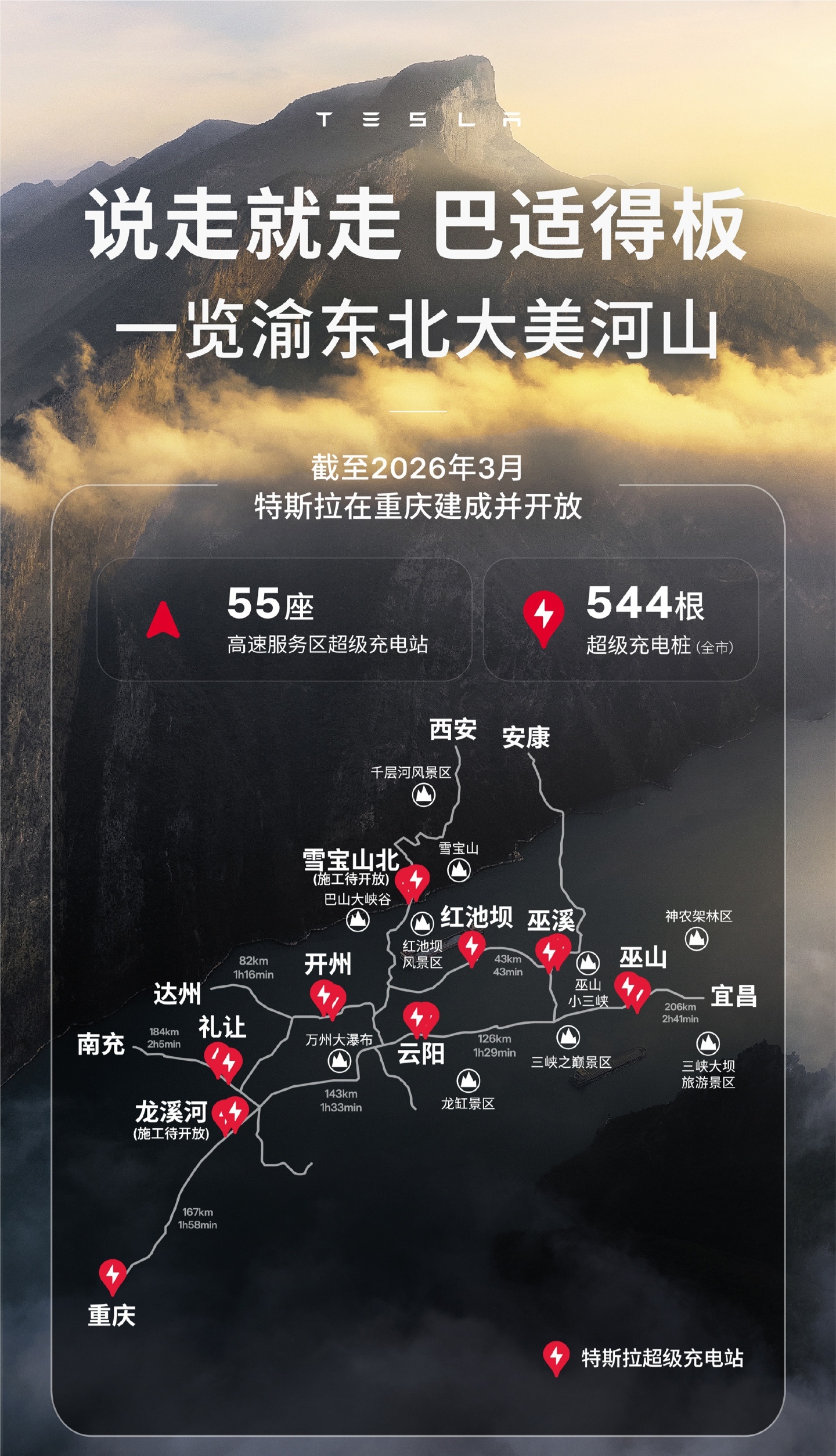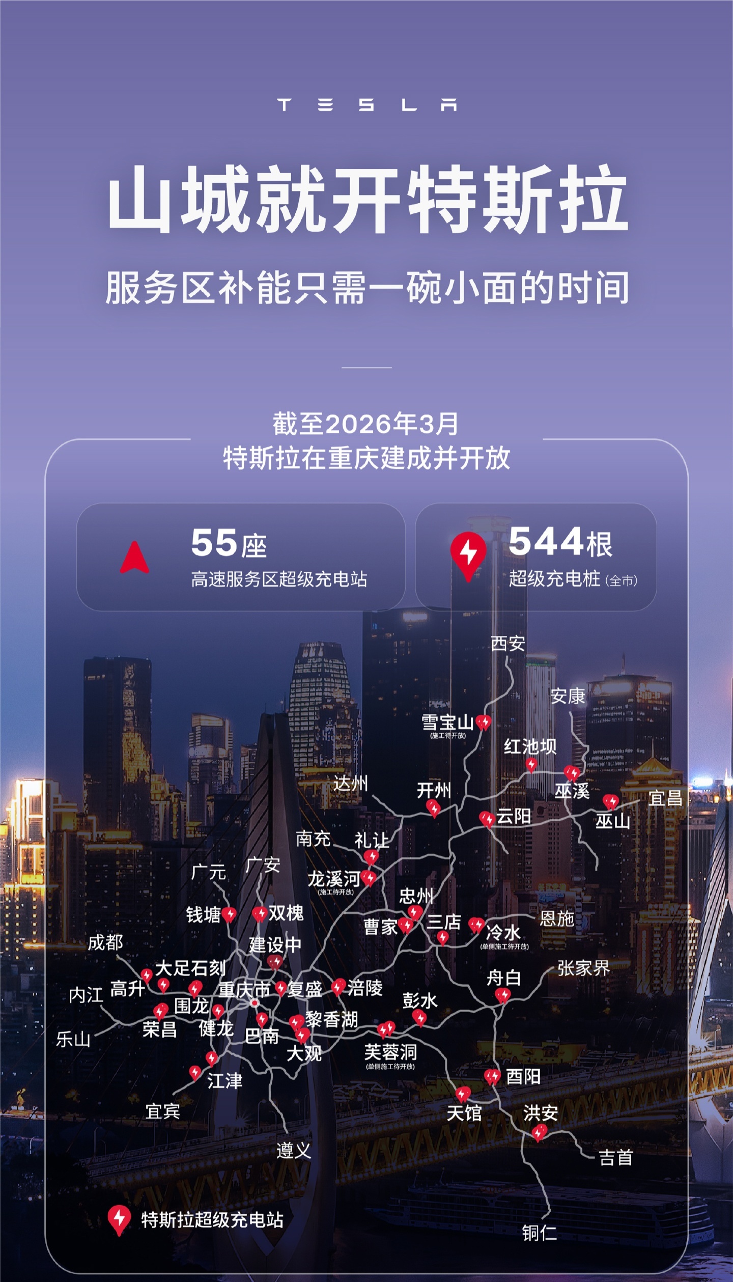 IT之家 3 月 28 日消息,特斯拉今日宣布,55 座特斯拉超级充电站在重庆高速服务区落成,面向非特斯拉车辆开放。