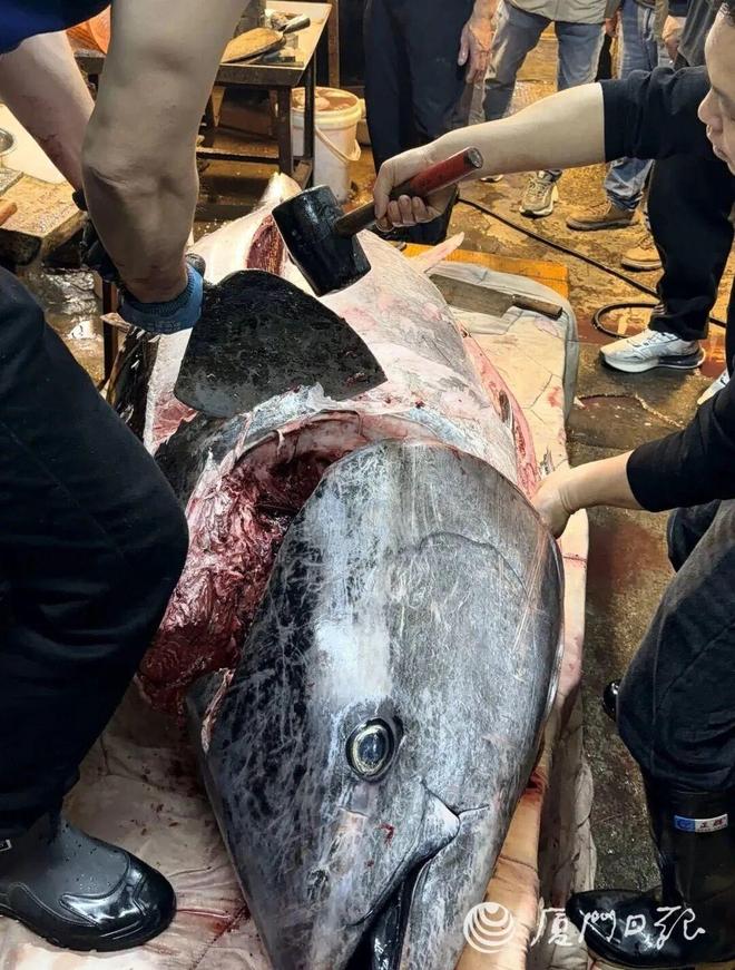 在昨日清晨8点40分,厦门第八市场的大鼓深海鱼店迎来了大量顾客,一条特别引人注目的蓝鳍金枪鱼成为了众人瞩目的焦点。