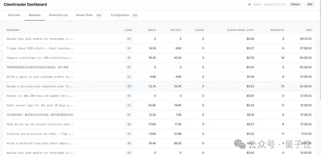 - 可视化Dashboard:支持中英双语,涵盖用量概览、会话记录、检测日志、路由规则配置与模型配置五个面板,所有改动即时生效、无需重启,方便用户按自身需求灵活调整。