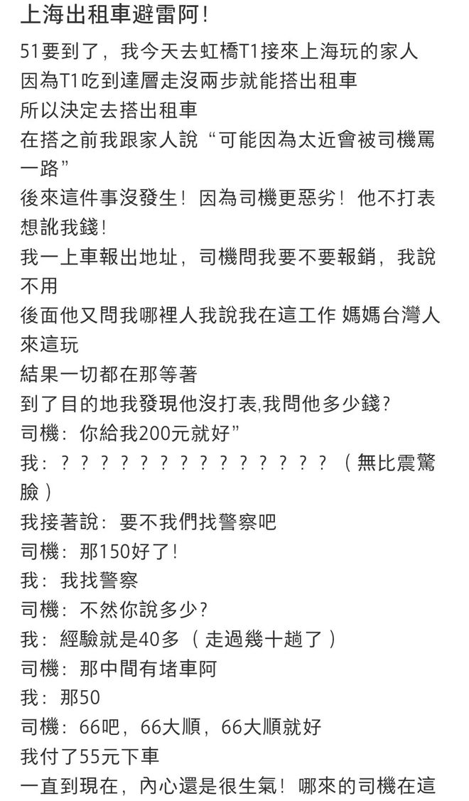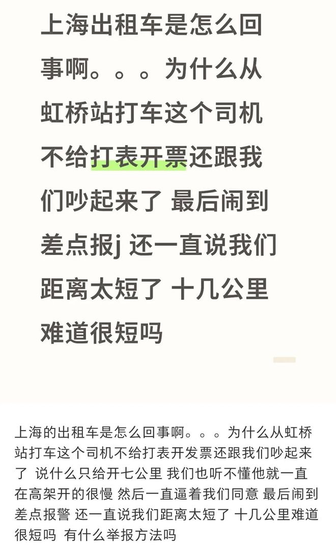 在社交媒体上也发现了类似的投诉案例:一位乘客在招手时被告知不使用计价器而直接收取200元费用的情况。另一名网友则表示,在虹桥站打车过程中遇到司机不愿开启计价器并因此发生争执。
