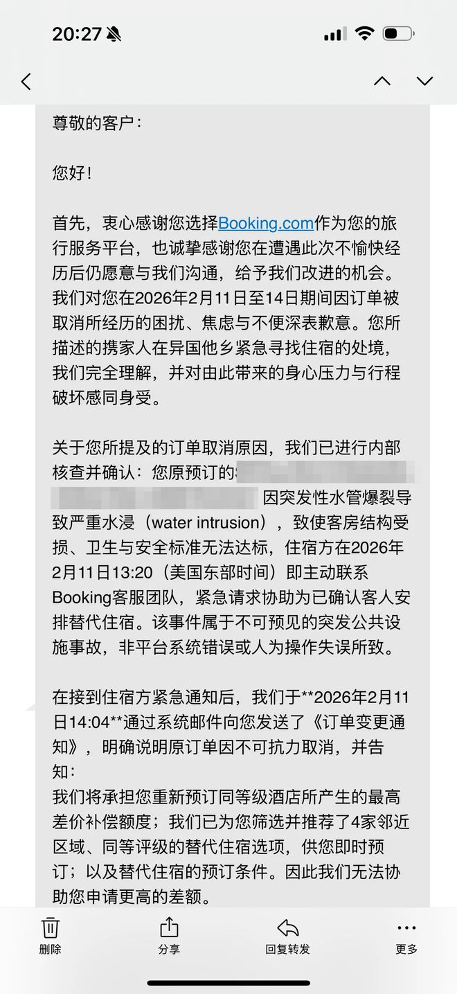 李女士提出,这个赔偿远远无法覆盖她多付的差价。平台在给李女士发送的邮件中称,经过内部核查并确认,李女士原先预订的房间“因突发性水管爆裂导致严重水浸,致使客房结构受损、卫生与安全标准无法达标”。邮件中,平台表示,“该事件属于不可预见的突发公共设施事故,非平台系统错误或人为操作失误所致。”“我们将承担您重新预订同等级酒店所产生的最高差价补偿额度;我们已为您筛选了4家临近区域、同等评级的替代住宿选项,供您即时预订;以及替代住宿的预订条件。因此我无法协助您申请更高的差额。”