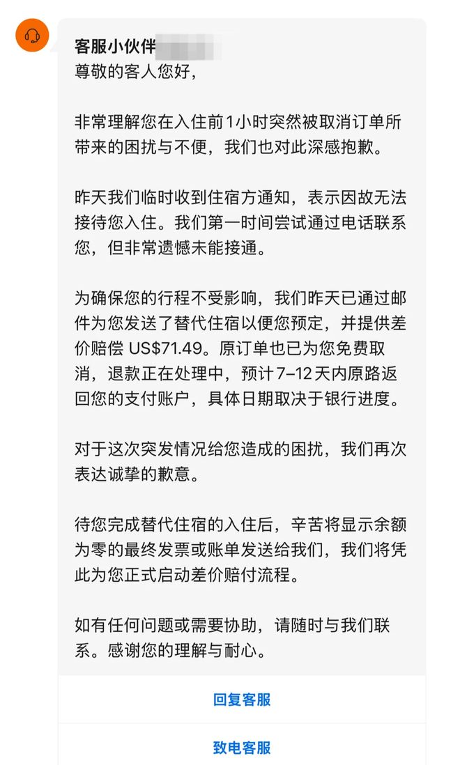 李女士告诉记者,平台全额退回了779.72美元的房费,并提出了一些价格相近的替代方案。但由于正值旺季且临近住宿时间,附近800美元左右的旅馆条件不尽如人意。李女士担心不安全,加之有8位家人需要住宿,于是她通过其它平台分别在希尔顿酒店和Holiday inn重新订了房间,“全部花费了1500多美元”,远远超过了当初的预算。李女士要求Booking平台赔偿差价,平台客服表示,最高只能提供71.49美元的差价赔偿。