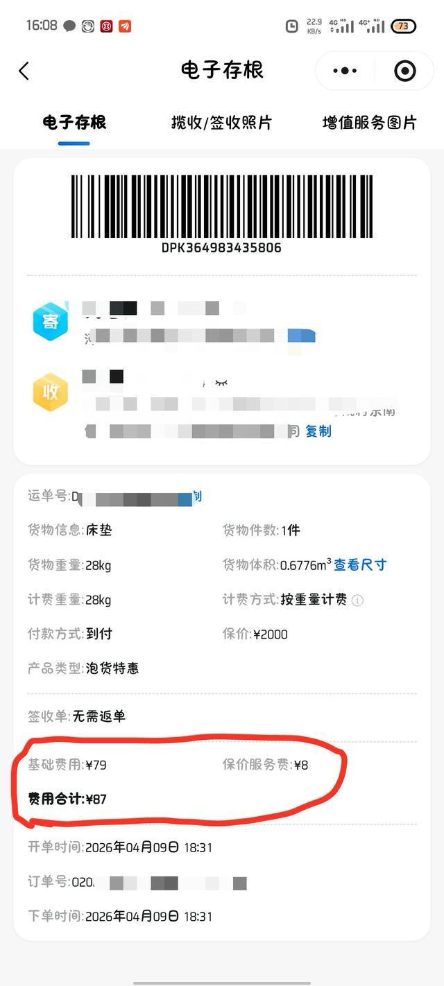 4月初,张先生在闲鱼平台上购买了一件现代索纳塔十代的全新前机盖及其他配件,机盖价值为1999元。为了确保货物的安全到达,他选择了德邦物流并支付了相应的保价费用79元及8元的服务费。