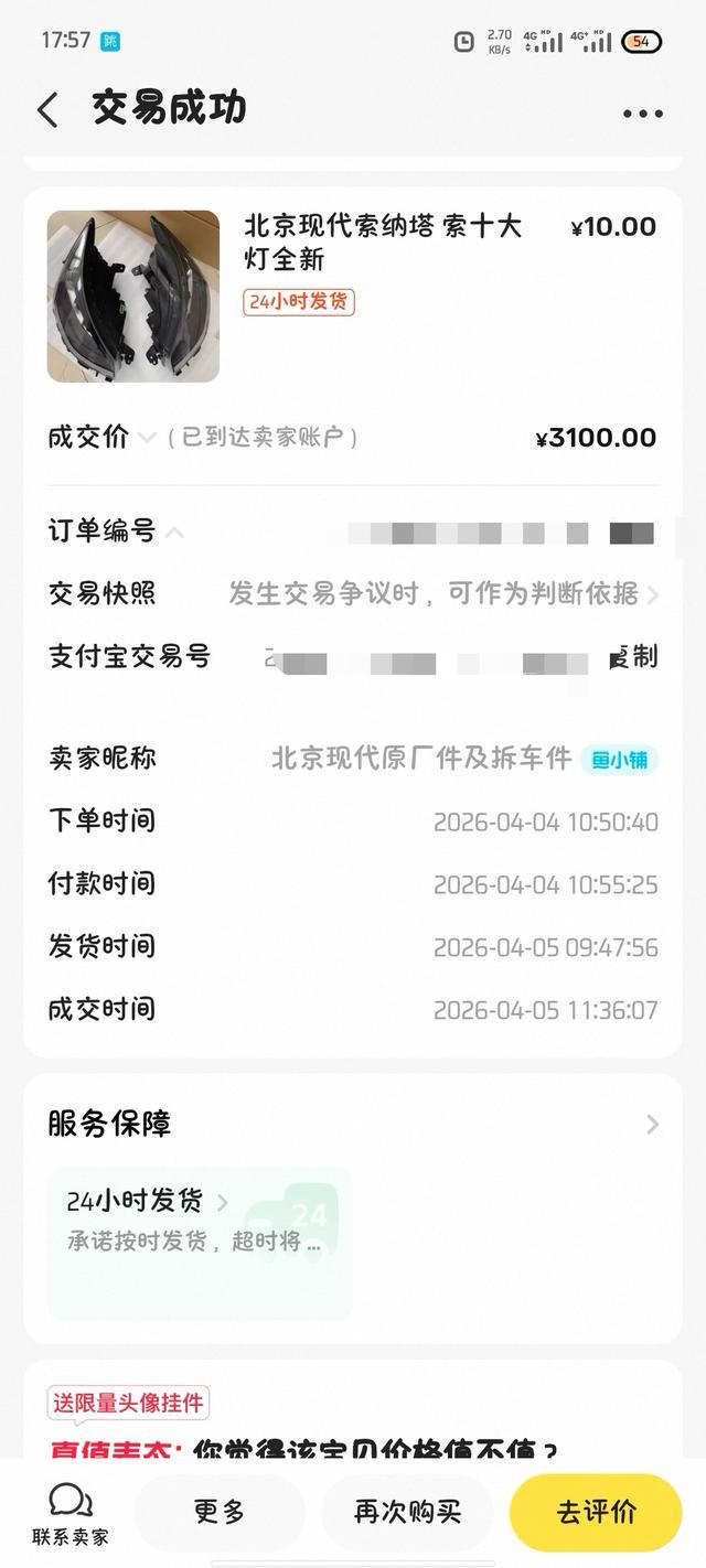张先生的闲鱼交易总价3100元,包含机盖、支架及相关小配件,交易页面标注为“大灯全新”