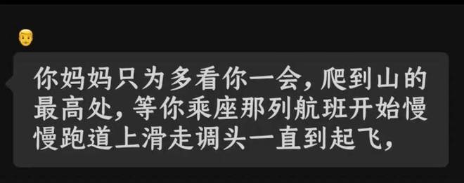 惠小姐说,她今天收到了父亲的信息,写道:“你妈妈只为了多看你一会,爬到了山的最高处,等着你乘坐的航班从跑道滑行起飞。”简单的一句话,却让人感到无比温暖。她回忆说,当时她第一时间把视频发到了家庭群聊里,说在空中看到了母亲。