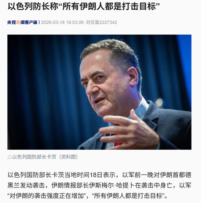 以色列国防部长卡茨当天表示,伊朗所有人员都可能成为袭击目标。