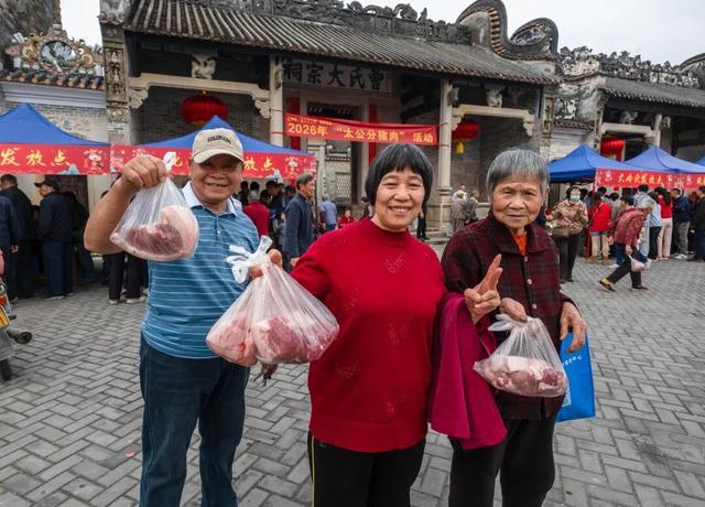 村内2195位60岁及以上的长者凭“肉票”,在曾氏大宗祠门前领到新鲜猪肉,每人2斤,全村共计分了4300多斤。在新春佳节来临之际,大家开心地同享寓意吉祥祝福的“福肉”。