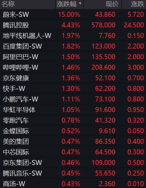 科技网络股普遍表现良好,腾讯控股股价涨幅超过4%,百度集团、阿里巴巴、哔哩哔哩、京东健康以及快手等公司的股票均上涨超过1%。