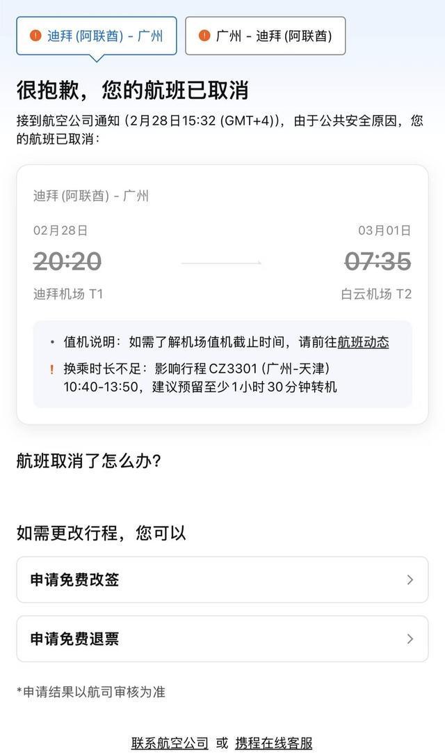 “我们立即在迪拜找了酒店入住,并联系航空公司重新安排行程。本来是把票从2月28号改到了3月3号,但没过多久又被通知取消,现在订的是3月7号的。”