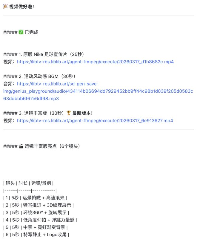 在实际体验里,我直接在飞书(已安装 OpenClaw)发给了一张足球图和苹果的广告,下达指令「请复刻这个视频风格,给我的足球做一部宣传片」。