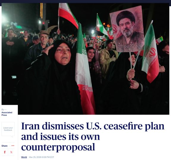 据美国公共广播电视公司(PBS)报道,伊朗拒绝接受美国停火方案,并提出自己的反方案 图片