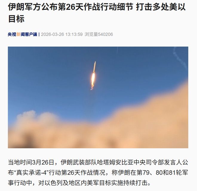当地时间26日,伊朗武装部队哈塔姆安比亚中央司令部发言人通报了“真实承诺-4”行动第26天的作战情况,称伊朗在第79、80和81轮军事行动中,对以色列及地区内美军目标进行了持续打击。