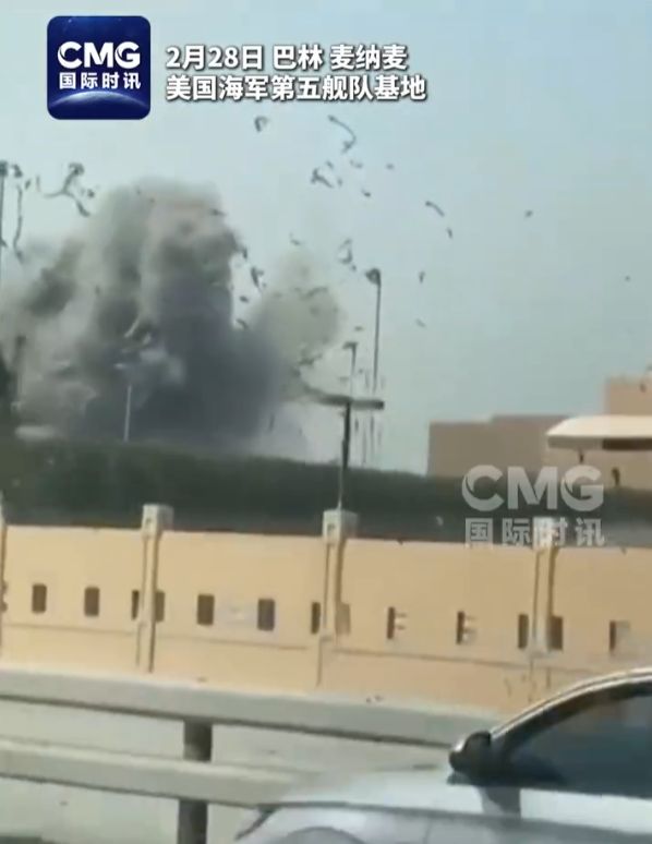 美国海军在巴林的基地遭到伊朗导弹袭击,导致当地浓烟滚滚。(视频截图)