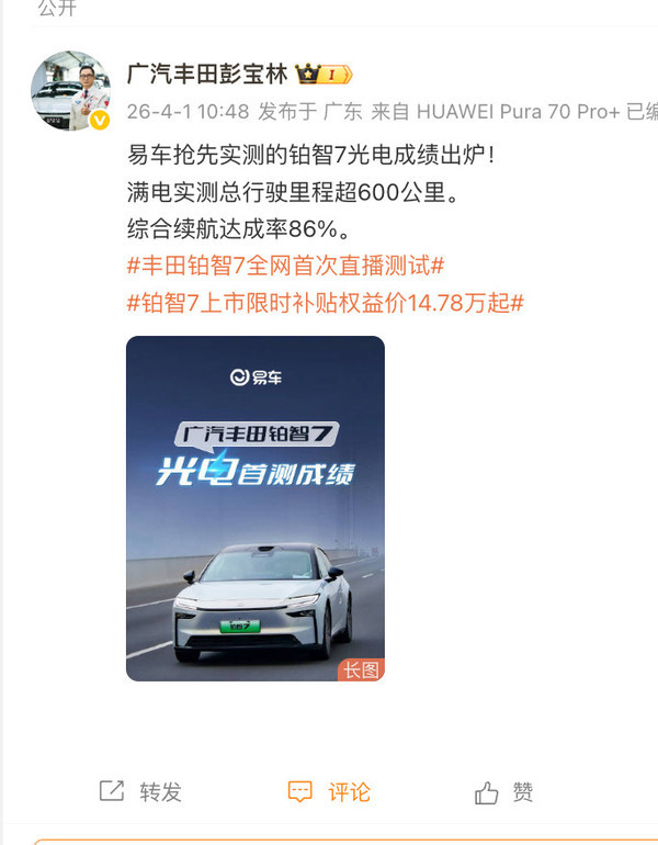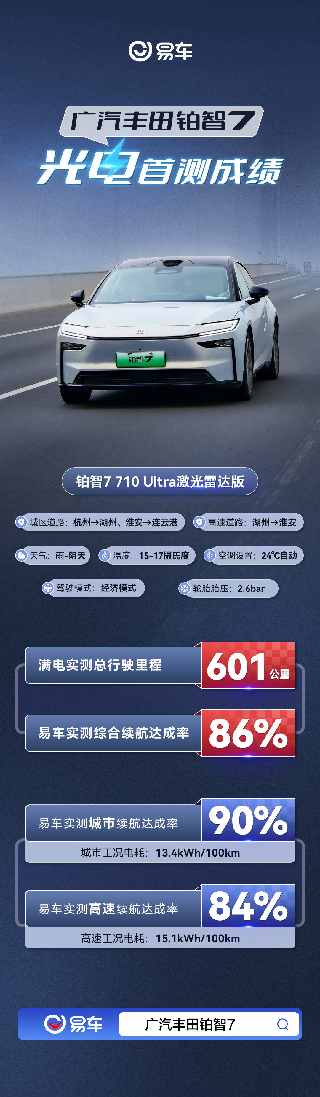 4月1日,广汽丰田铂智7 710 Ultra激光雷达版的光电续航测试结果出炉。在城市和高速路段的综合工况下,车辆实测总行驶距离为601公里,达到了标称续航里程的86%。